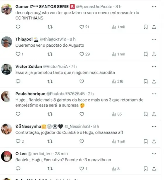 Fora esses dois nomes, o Corinthians, então, só segue se movimentando e fazendo buscas pelas melhores peças. O novo presidente do Timão, Augusto Melo, chegou até mesmo fazer uma promessa a Fiel.
