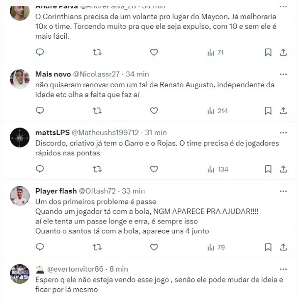 Como uma primeira ação do novo comandante, a torcida encheu as redes sociais pedindo a chegada de Igor Coronado durante o confronto. Para muitos, faltou criatividade no meio-campo corinthiano. Veja comentários (SIC).