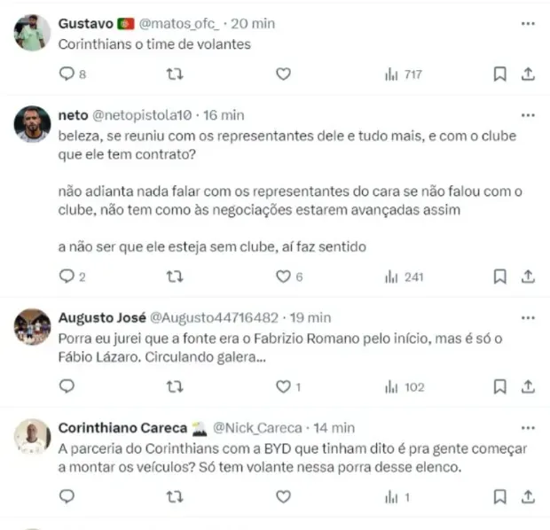 “A diretoria do Corinthians se reuniu com os empresários do volante Walace Souza, da Udinese, e avançou na negociação com o atleta, que agora está muito próximo de vestir a camisa do Timão“, escreveu o jornalista em uma publicação no seu X, antigo Twitter.