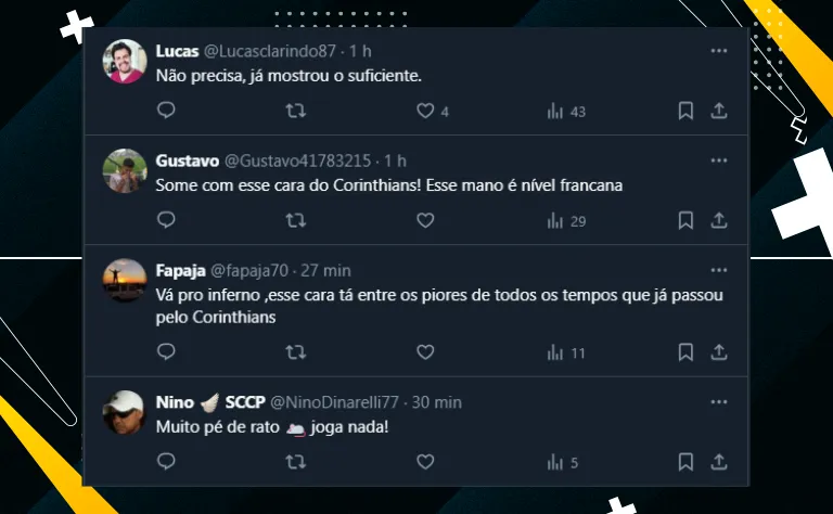 Em 21 partidas disputadas até aqui no torneio, o Timão venceu apenas quatro. Não à toa, aparece na 18ª posição, afundado na zona de rebaixamento e com grande parte do elenco jogando mal.