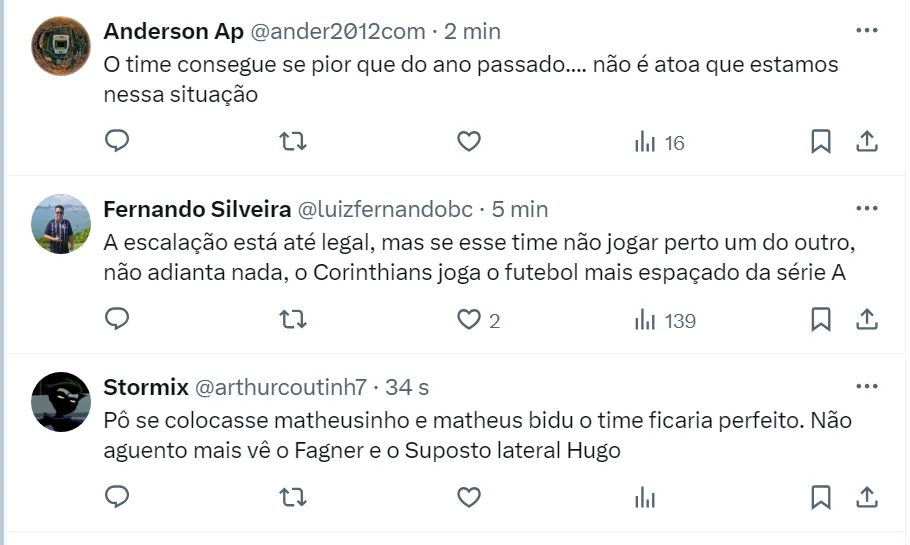 O Corinthians ainda não venceu no Campeonato Brasileiro após três rodadas e enfrenta o Fluminense neste domingo (28), às 16h (de Brasília), na Neo Química Arena, e o time de António Oliveira busca uma reação.
