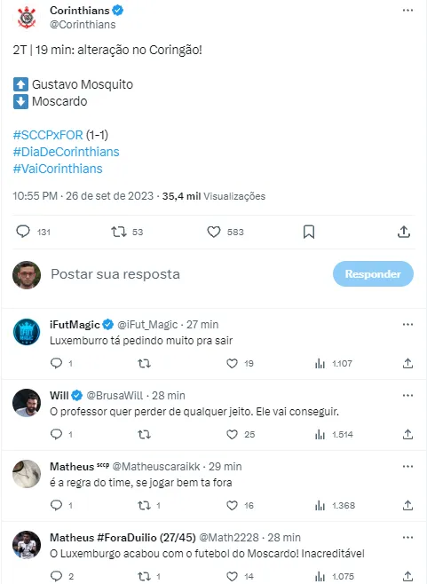 Isso porque o garoto deixou o gramado da Neo Química Arena ainda aos 19 da 2ªetapa, para o desespero da Fiel. Nas redes sociais, Luxa virou alvo de muitas reclamações pela forma como vem utilizando Moscardo. A opinião mais citada na internet é que o jogador está sendo desperdiçado pelas orientações do treinador. Mesmo que isso seja ainda apenas o primeiro duelo, a joia do Terão já pode se preocupar. Tudo será decidido no Castelão, na próxima terça-feira (3), a partir das 21h30.