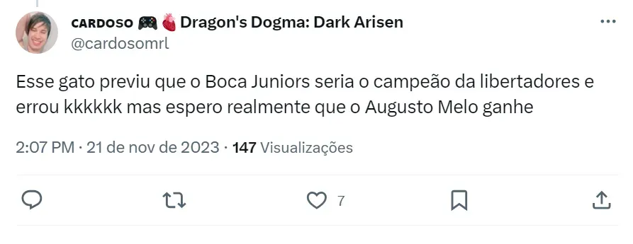 Nas redes sociais, o gatinho Milu voltou a atacar e indicou o resultado do pleito do próximo sábado (25). Segundo ele, o vencedor da eleição do Corinthians vai ser Augusto Melo.