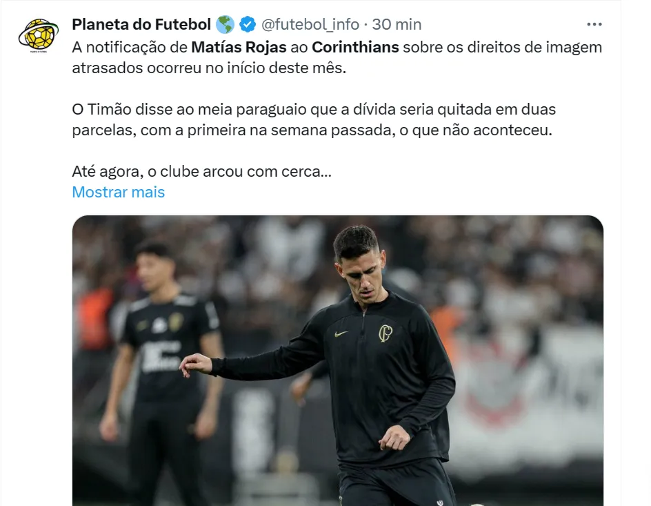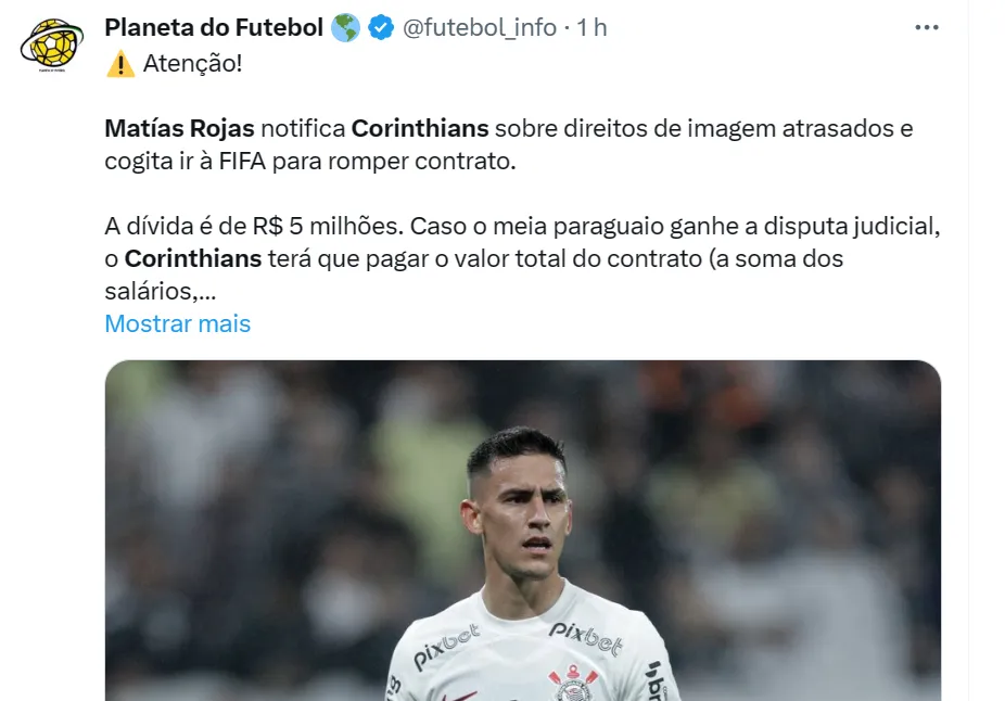 🚨 | Matías Rojas notificou o Corinthians sobre atrasos no pagamento dos seus direitos de imagem, e cogita ir até a FIFA para romper o contrato com o Timão.