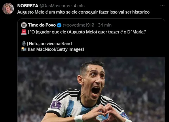 “Dí Maria não precisa falar, campeão do mundo. Ele é argentino, combina com o Corinthians. Estamos monitorando todos e faremos um time para ganhar tudo“, disse Augusto melo ao UOL, nesta semana.