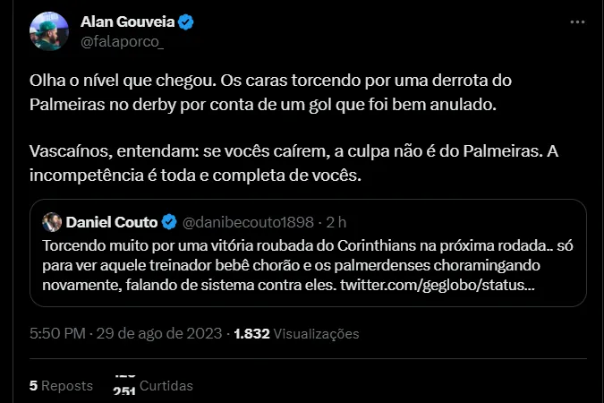Outro palmeirense rebateu, alertando até para o risco de queda: “Olha o nível que chegou. Os caras torcendo por uma derrota do Palmeiras no derby por conta de um gol que foi bem anulado. Vascaínos, entendam: se vocês caírem, a culpa não é do Palmeiras. A incompetência é toda e completa de vocês”, frisou.