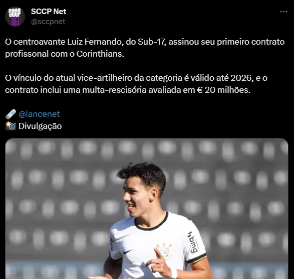 Nesta sexta-feira (8), o Corinthians fechou o primeiro contrato profissional com o atacante Luiz Fernando, joia da base. O vínculo é válido até agosto de 2026 e a multa rescisória está avaliada em 20 milhões de euros (R$ 106,6 milhões), de acordo com o Meu Timão. Luiz é o vice-artilheiro do Corinthians, com nove gols em 22 jogos no Sub-17.