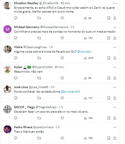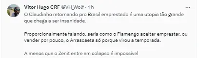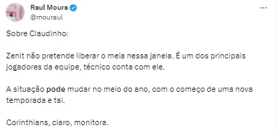 “Sobre Claudinho: Zenit não pretende liberar o meia nessa janela. É um dos principais jogadores da equipe, técnico conta com ele”, iniciou o colega através de publicação em suas redes sociais.