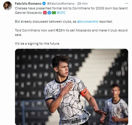 “Moscardo: Corinthians e Chelsea discutem venda de até 25 milhões de euros (21+4 milhões de euros) + 10% de futura venda. Jovem volante ficaria no Timão até junho de 2024”, informou o jornalista Bruno Andrade.