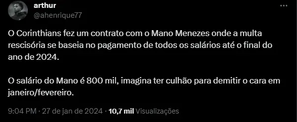 Ou seja, caso o Corinthians queira demitir Mano Menezes em um futuro próximo, teria que pagar uma multa de quase R$ 20 milhões. Atualmente, o valor correto é de R$ 18,4 milhões. A multa vai diminuindo conforme o tempo vai passando.