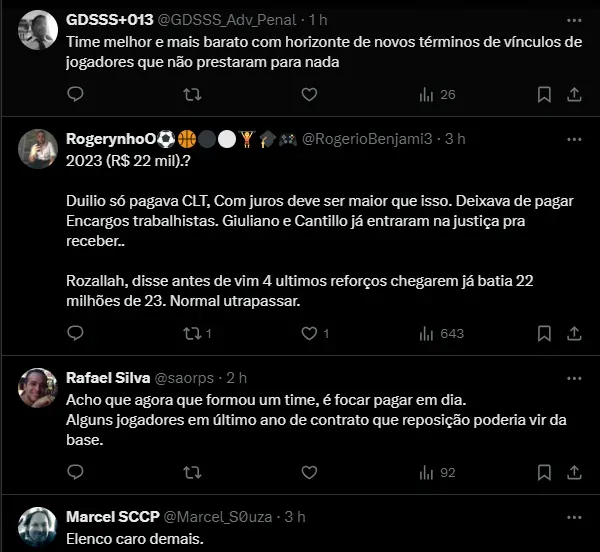 “Paulinho, Ruan Oliveira, Bidu, Mosquito, Raul Gustavo, Fausto Vera……todos inúteis. Coronado e Yuri com salários absurdamente alto“, “Elenco caro demais. Corinthians é um dos que mais gastam com salário no BR, mas tá longe de ter o melhor elenco“, foram algumas reclamações.