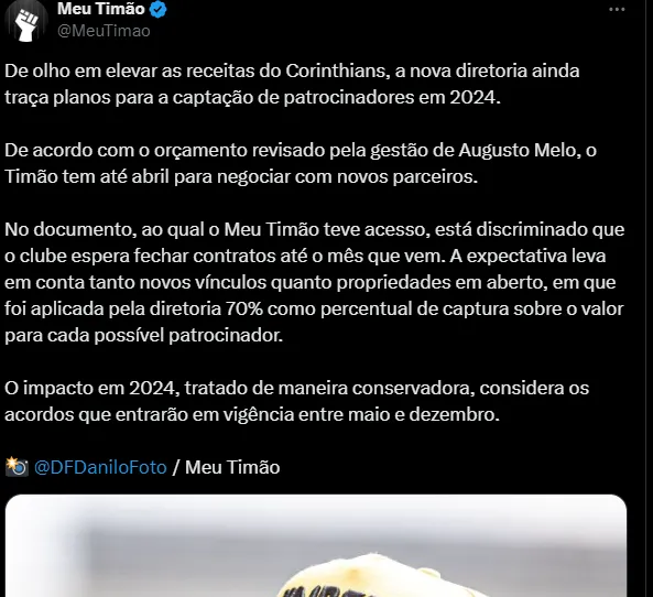 De acordo com apuração do portal Meu Timão, Augusto Melo colocou o mês de abril como prazo limite para conseguir fechar com novos patrocinadores e ocupar todos os lugares vagos.