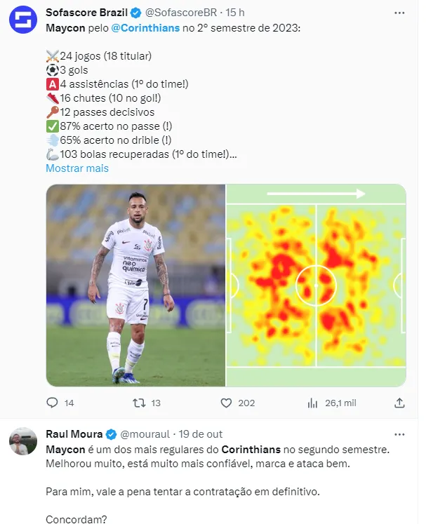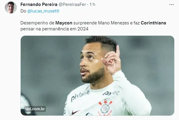Segundo informações apuradas e trazidas pelo jornalista Lucas Musetti, do Uol Esporte, Mano Menezes estaria ficando surpreso e contente com o meio-campista Maycon, que após ficar fora dos planos em um certo parte do ano, agora, ele ganha uma sobrevida e pode ficar no Parque São Jorge para 2024.