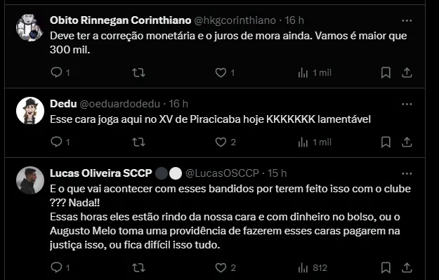 No seu canal no YouTube, Jorge Nicola trouxe a seguinte informação. O Corinthians possui uma dívida com Denis Baum, cantor de pagode. Dessa maneira, a equipe estaria devendo cerca de R$ 300 mil ao artista.