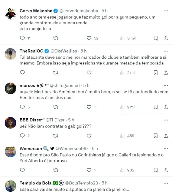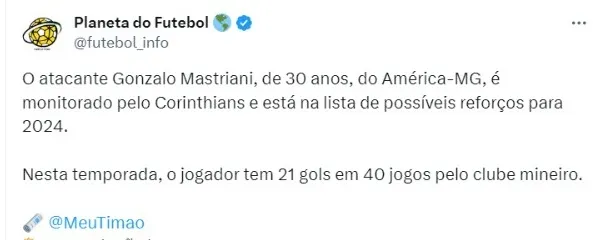 O atacante Gonzalo Mastriani, de 30 anos, do América-MG, é monitorado pelo Corinthians e está na lista de possíveis reforços para 2024.