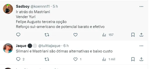 Vale lembrar que mesmo que decida realizar uma proposta por Mastriani, não será fácil. Isso porque times como Atlético-MG, Internacional e Vasco são concorrentes. Seu contrato vai até dezembro de 2025 com o América-MG, que adquiriu 60% dos direitos por 600 mil dólares, algo em torno de R$ 3,1 milhões.