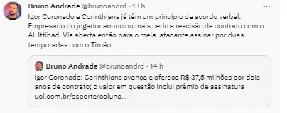 “Corinthians oferece 7 milhões de euros (R$ 37,5 milhões) num contrato válido por duas temporadas para Igor Coronado, que, segundo publicou mais cedo o meu querido Bruno Cassucci, encaminhou hoje a rescisão de contrato no Al-Ittihad. Ou seja, 3.5 milhões de euros por temporada”, completou Bruno Andrade