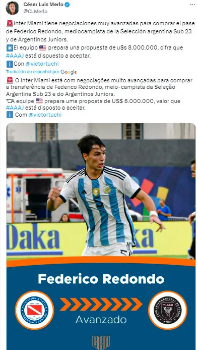 “O Inter Miami está com negociações muito avançadas para comprar a transferência de Federico Redondo, meio-campista da Seleção Argentina Sub 23 e do Argentinos Juniors”, iniciou o jornalista.