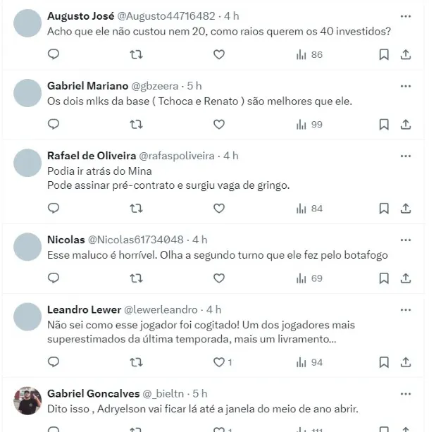 “Textor pede valor absurdo pela contratação do zagueiro Adryelson, e o Corinthians já não pensa mais na possibilidade de formalizar uma proposta. Textor queria recuperar os 40 milhões pago pelo atleta. O timão rapidamente disse NÃO!”, escreveu em seu perfil.