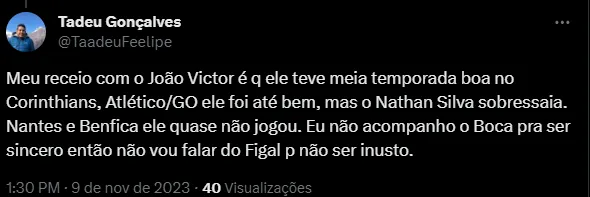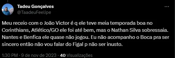 João Victor é considerado uma das grandes revelações do Corinthians nos últimos anos. Vendido em julho de 2022, por 8 milhões de euros (R$ 44 milhões na época). para o Benfica, o zagueiro não vem indo bem.
