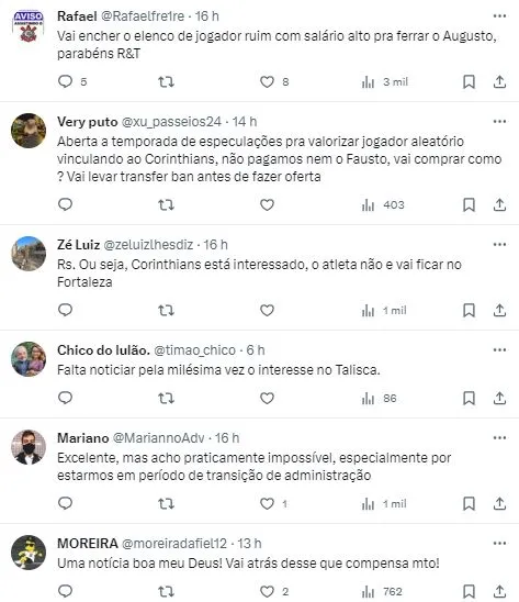Na sequência, detalhou o problema para que o Corinthians avance sobre o meio-campista: “O grande problema é que o Fortaleza pede 10 milhões de dólares para negociar 100% dos direitos econômicos, algo na casa dos R$ 50 milhões, o que torna a negociação inviável, tanto o Corinthians, quanto seus dois arquirrivais não terão condições de bancar o negócio”, explicou.