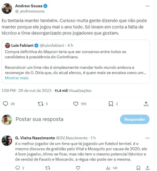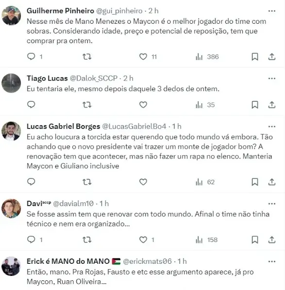 “Compra definitiva do Maycon teria que ser consenso entre todos os candidatos à presidência do Corinthians. Reconstruir um time não é simplesmente mandar todo mundo embora e recomeçar do 0. Diria que, do atual elenco, é quem mais se encaixa como um pilar para 2024. Precisa começar a conversar agora”, afirmou Luís Fabiani, setorista do Alvinegro pela Itatiaia.