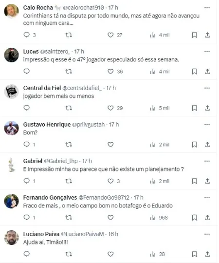 No entanto, da mesma forma que vários estão saindo, muita gente nova deve chegar em breve. O novo mandatário corinthiano quer contratar, no mínimo, uns 10 reforços, sendo que a maioria com status de titular.
