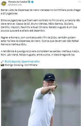 A reformulação dentro do Corinthians é um assunto que está tomando conta do Parque São Jorge. Com a chegada de Mano Menezes, existe uma grande expectativa para que alguns jogadores deixaram o Timão ao fim desta temporada. Ainda é válido destacar que dentro do plantel alguns nomes têm seus contratos se encerrando no fim da temporada e alguns desses não devem renovar.