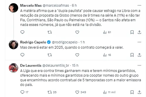Todos os times estão de olho nisso, pois a presença do Peixe e do Timão é crucial para a emissora para que o negócio seja fechado. O impacto do acordo entre Corinthians, Globo e Libra é essencial. Porém, os dois clubes avaliam os cenários, uma vez que também tem propostas para fazer parte de outra Liga.