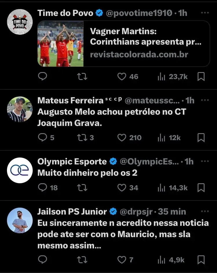 Segundo informações do jornalista Vagner Martins, em seu canal no YouTube, o Corinthians apresentou propostas oficiais ao Internacional para contratar Alan Patrick e Mauricio.
