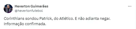 A informação inicial do interesse do Timão no atleta foi exposta pelo apresentador Heverton Guimarães. “Corinthians sondou Patrick, do Atlético. E não adianta negar. Informação confirmada”, garantiu o colega em suas redes sociais.