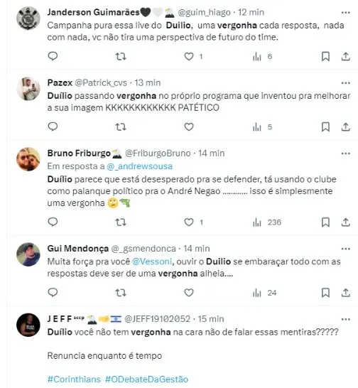 Nesta sexta-feira (10), Duílio teve um debate sobre sua gestão, onde chamou seis dos setoristas do Timão, mas acabou dando respostas que geraram ainda mais revolta na Fiel, que não perdoou nas redes sociais.