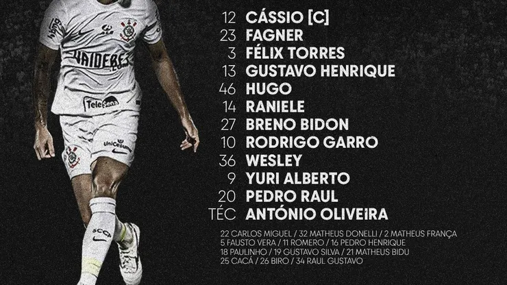 O treinador Antônio Oliveira vem com: Cássio, Fagner, Felix Torres, Gustavo Henrique e Hugo; Raniele, Breno Bidon e Rodrigo Garro; Wesley, Yuri Alberto e Pedro Raul