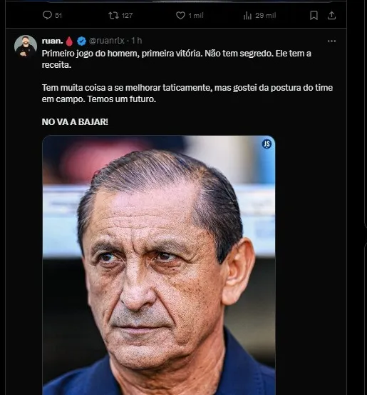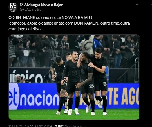 O treinador fez sua primeira partida oficial com o Timão e conseguiu o terceiro triunfo da equipe no Campeonato Brasileiro. Após o jogo, o termo “NO VA A BAJAR” começou a surgir nas redes sociais.