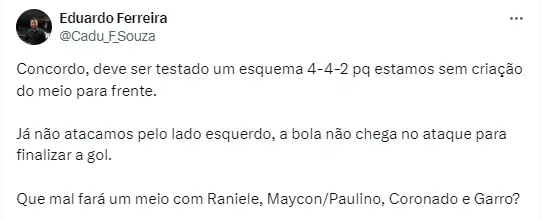 O treinador português tem como objetivo recuperar o futebol do camisa 5, para que ele renda algo parecido com 2022, quando chegou ao clube. Ainda assim, Maycon era titular absoluto do time e segundo o Gazeta Esportiva pode recuperar sua vaga contra o Juventude. A definição deve vir após os próximos treinamentos.