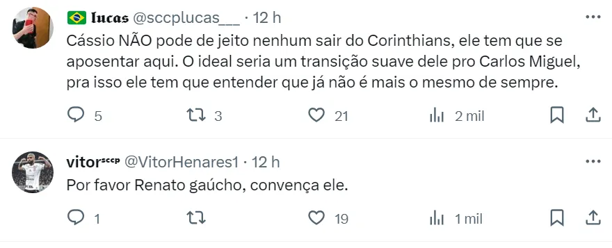 Cássio tem 36 anos e é um dos grandes ídolos da história do Corinthians. Ele está no Timão desde 2012 e conquistou títulos relevantes pelo Alvinegro, como o Mundial de Clubes, a Copa Libertadores e um bicampeonato brasileiro.