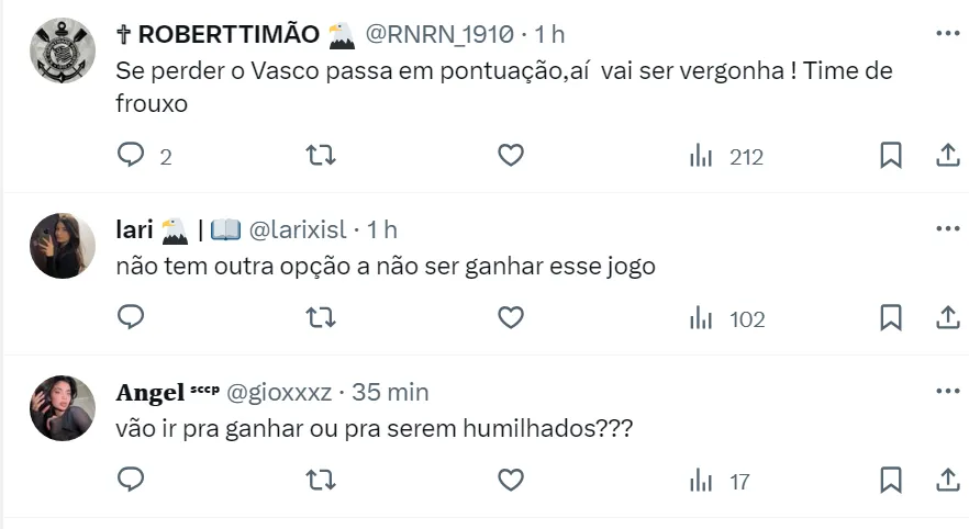 “O Bahia tem 41, Vasco 42, Santos 43 e Corinthians tem 44. Isso aqui tá enroladíssimo. O Corinthians corre um sério risco de cair. Depois do 5 a 1 que tomou do Bahia, meu Deus do céu…”, afirmou.