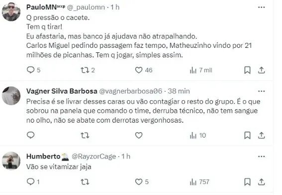 “Na reunião com os dirigentes do Corinthians (ontem com Rubão e hoje com Augusto Melo), as lideranças das torcidas organizadas avisaram que a pressão sobre os jogadores mais experientes do elenco (Cássio e Fágner) vai ser bem grande a partir de agora para que eles voltem a jogar um bom futebol“, disse o jornalista.