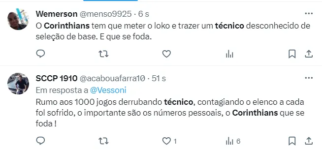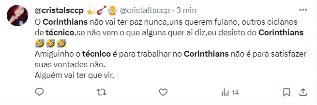 Em nota no instagram, mano comentou sobre a demissão: “A nova direção do Corinthians, 33 dias após assumir o clube, decidiu pela interrupção do nosso trabalho. Agradeço ao torcedor corinthiano que sempre foi muito carinhoso e respeitoso comigo e com a minha equipe”.