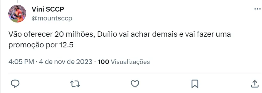 Enquanto não define o seu futuro, o jovem volante segue atuando no Timão e está à disposição de Mano Menezes para o duelo deste domingo (5), às 16h (de Brasília), contra o Bragantino, pela 32ª rodada do Brasileirão.