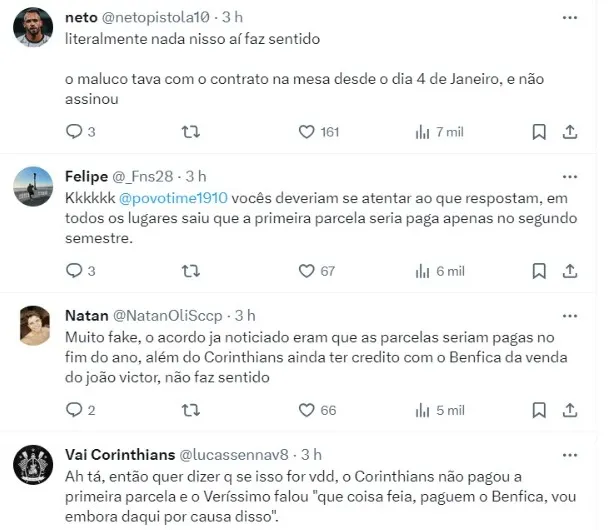 Sem o pagamento, o staff de Lucas Veríssimo recebeu proposta do Al Duhail e aceitou. O Benfica fechou a venda por 9 milhões de euros (R$ 48,5 milhões) no último fim de semana. Em nota, o Corinthians destacou que o contrato definitivo estava na mesa.