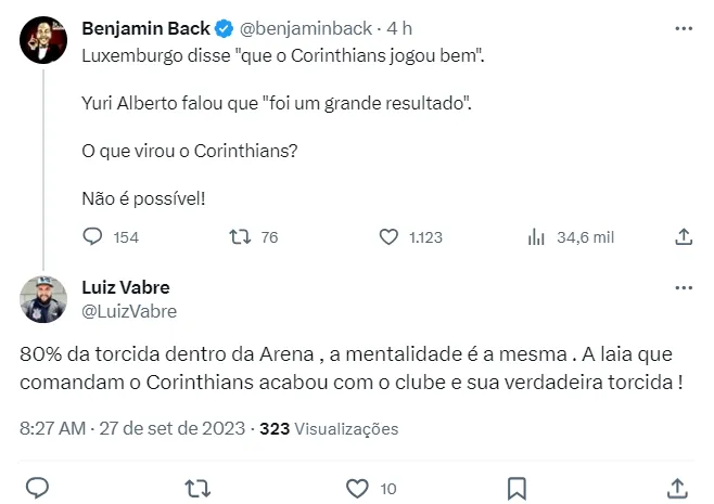 Por meio do Twitter, o apresentador Benjamin Back criticou as declarações pós-jogo tanto do técnico quanto do camisa 9 do Corinthians. Enquanto um falou que o time jogou bom, o outro elogiou o placar obtido diante do Fortaleza, respectivamente. Isso gerou críticas justamente pela forma como a equipe vem atuando, que não esboça sorrisos nas arquibancadas. A pressão aumenta para o jogo de volta, quando o Leão do Pici vai decidir em casa, no Castelão.