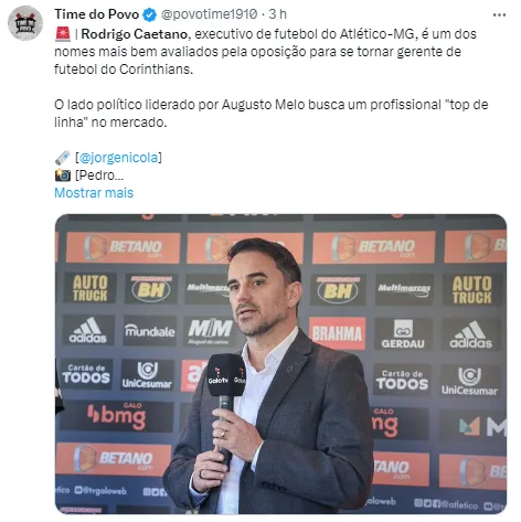 E no meio deste caldeirão que está o Timão, ainda tem em novembro a eleição no clube que elegerá o 32º presidente da história do Corinthians. Um desses candidatos à presidência, Augusto Melo, que é de oposição, já começa a demonstrar suas vontades para adquirir apoio. De acordo com o jornalista Jorge Nicola, o candidato está interessado em tornar Rodrigo Caetano, executivo de futebol do Atlético-MG, como gerente de futebol do Timão.