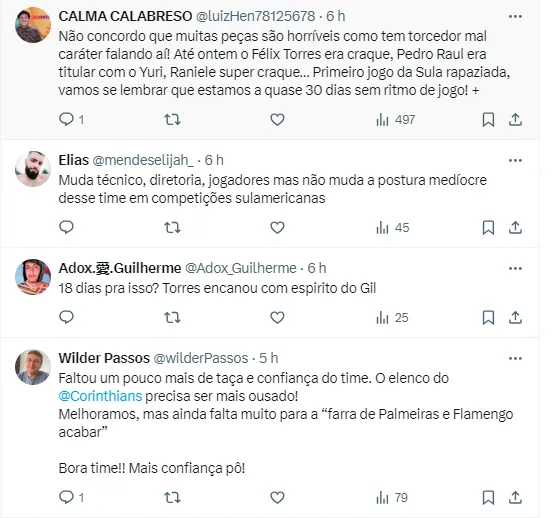 O setor defensivo também foi muito criticado. Félix Torres foi mal, assim como Gustavo Henrique. António Oliveira foi criticado por colocar Cacá no jogo, sendo que ele estava frio. Foi neste momento que o gol adversário saiu. Inclusive, o destaque do Timão no jogo falou sobre o sentimento do gol sofrido.