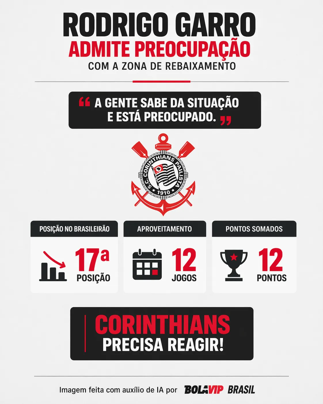 Pela 12ª rodada do Campeonato Brasileiro, o Corinthians voltou a tropeçar neste sábado (18). No Barradão, em Salvador, o Timão ficou no empate sem gols com o Vitória, em uma partida de poucas emoções ao longo dos 90 minutos, preocupando a Fiel Torcida.