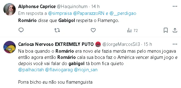 Romário acredita que a atitude de Gabigol não teve a intenção de desrespeitar o Flamengo, clube no qual o atacante é ídolo. “Posso afirmar que esse gesto não foi em desrespeito ao Flamengo. Foi por algum motivo, que ainda não sei qual é, mas vou acabar sabendo porque temos amigos em comum,” explicou o ex-jogador.