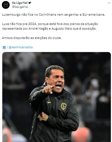 “No entanto, a coluna apurou que independente do que aconteça em 2023, Luxa não será técnico do Corinthians em 2024. Não há chance de permanência nem se o treinador levar o Timão a conquista inédita da Copa Sul-Americana. O Corinthians se classificou para a semifinal para enfrentar o Fortaleza”, informou Samir.