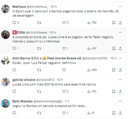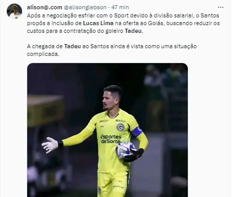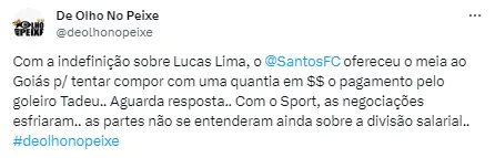 “Com a indefinição sobre Lucas Lima, o Santos ofereceu o meia ao Goiás para tentar compor com uma quantia em dinheiro o pagamento pelo goleiro Tadeu. Aguarda resposta. Com o Sport, as negociações esfriaram, as partes não se entenderam ainda sobre a divisão salarial”, publicou o De Olho no Peixe.