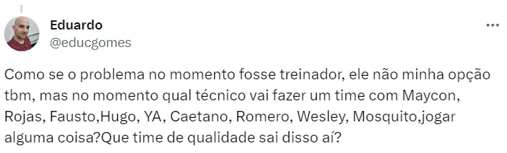Vale ressaltar que Augusto Melo bancou a permanência de Mano Menezes após a derrota por 3 a 1 para o Novorizontino, em Itaquera. No entanto, um dia depois, a demissão confirmada pelo clube.