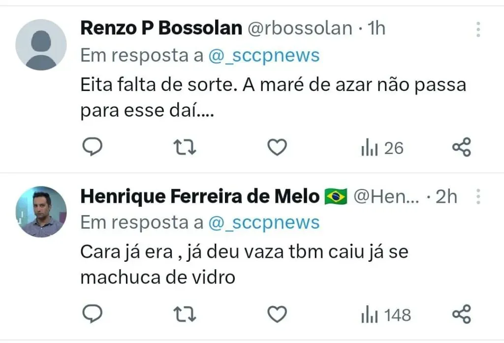 “Eu tô começando a achar que ele quer sair do Corinthians porque não é possível até o Giuliano está mais inteiro que ele”, disse um internauta. “Antes de entrar em campo, tem que colocar um papel nas costas dele “Não encoste, risco de quebrar””, detonou outro.
